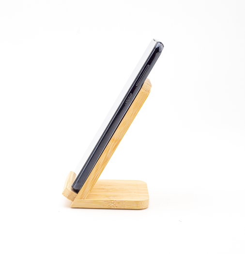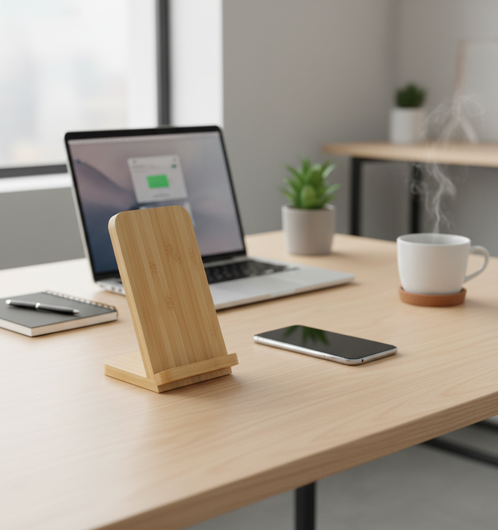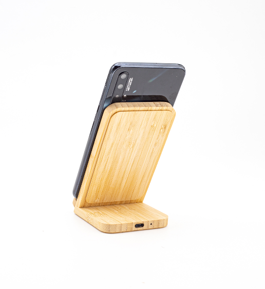 Portacelular en bambú con cargador inalámbrico integrado, diseñado para mantener tu dispositivo seguro mientras se carga sin cables. Fabricado con bambú de alta calidad, combina durabilidad natural con funcionalidad moderna. Compatible con la mayoría de smartphones que soportan carga inalámbrica Qi. Personalizable con tu logo mediante impresión o grabado láser, lo que lo convierte en una opción ideal para regalos corporativos o promocionales. Su base antideslizante asegura estabilidad durante la carga, mientras que el material ecológico refleja un compromiso con la sostenibilidad.