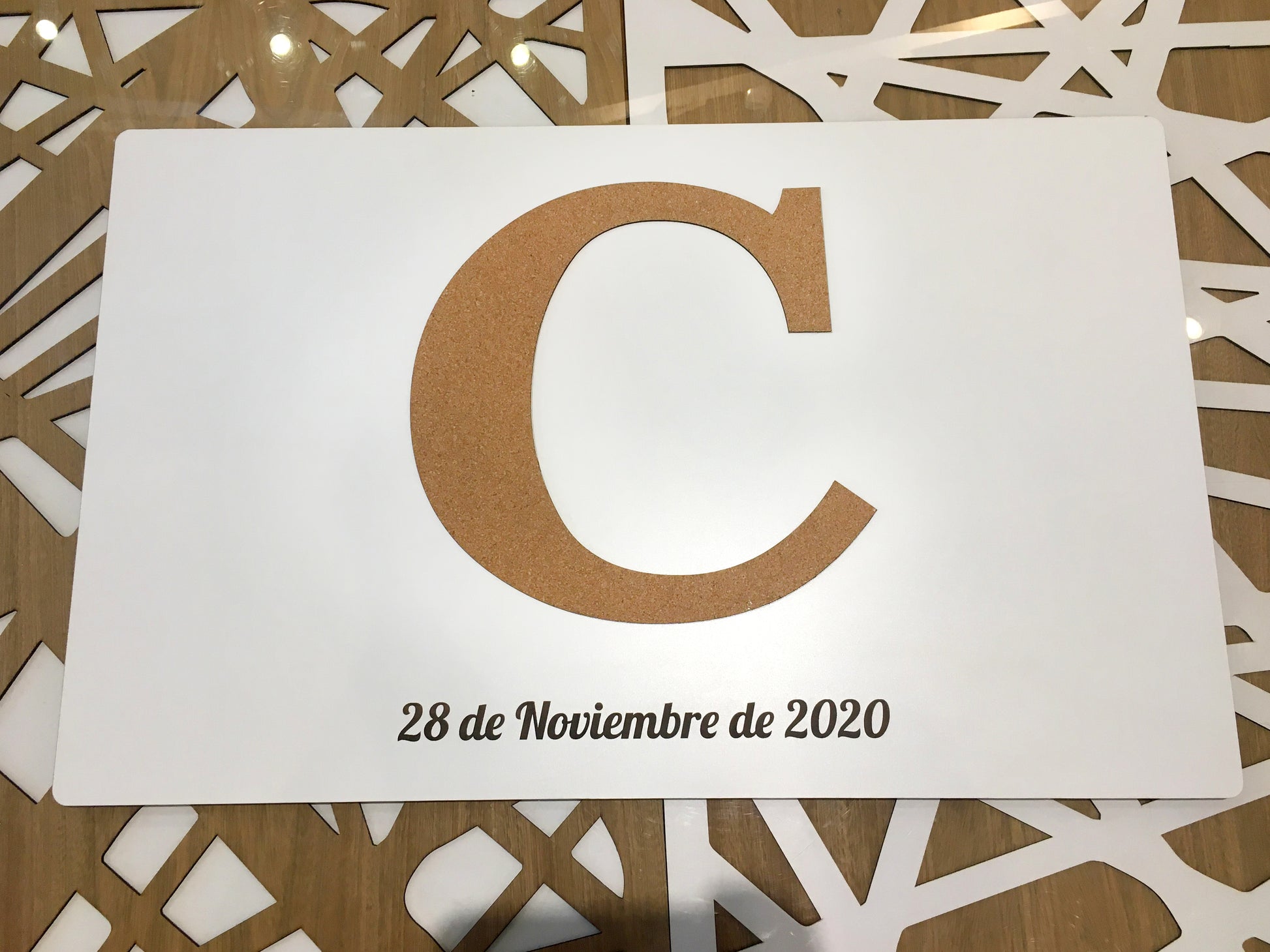 Porta firmas en melamínico blanco + fondo en mdf 6mm con inicial en corcho en relieve.