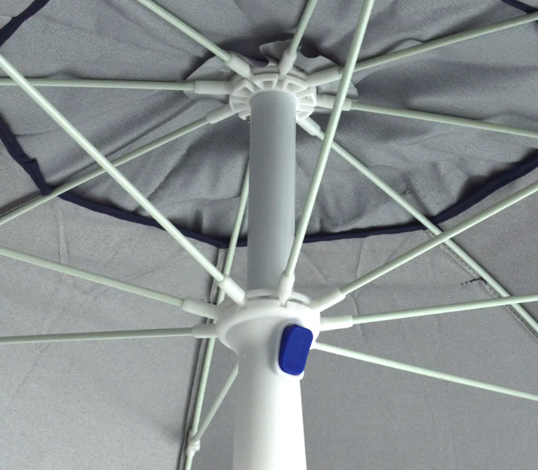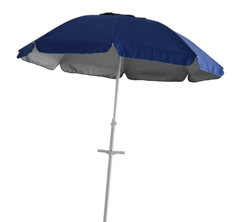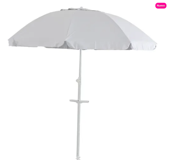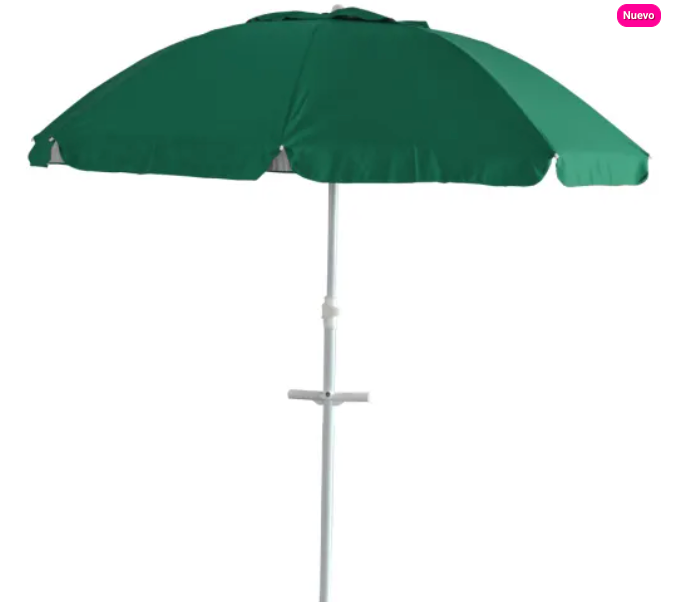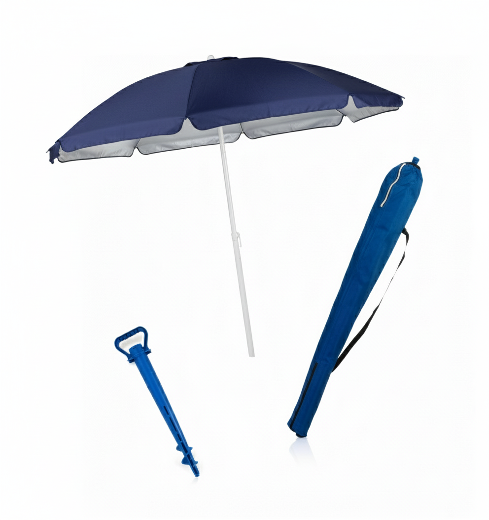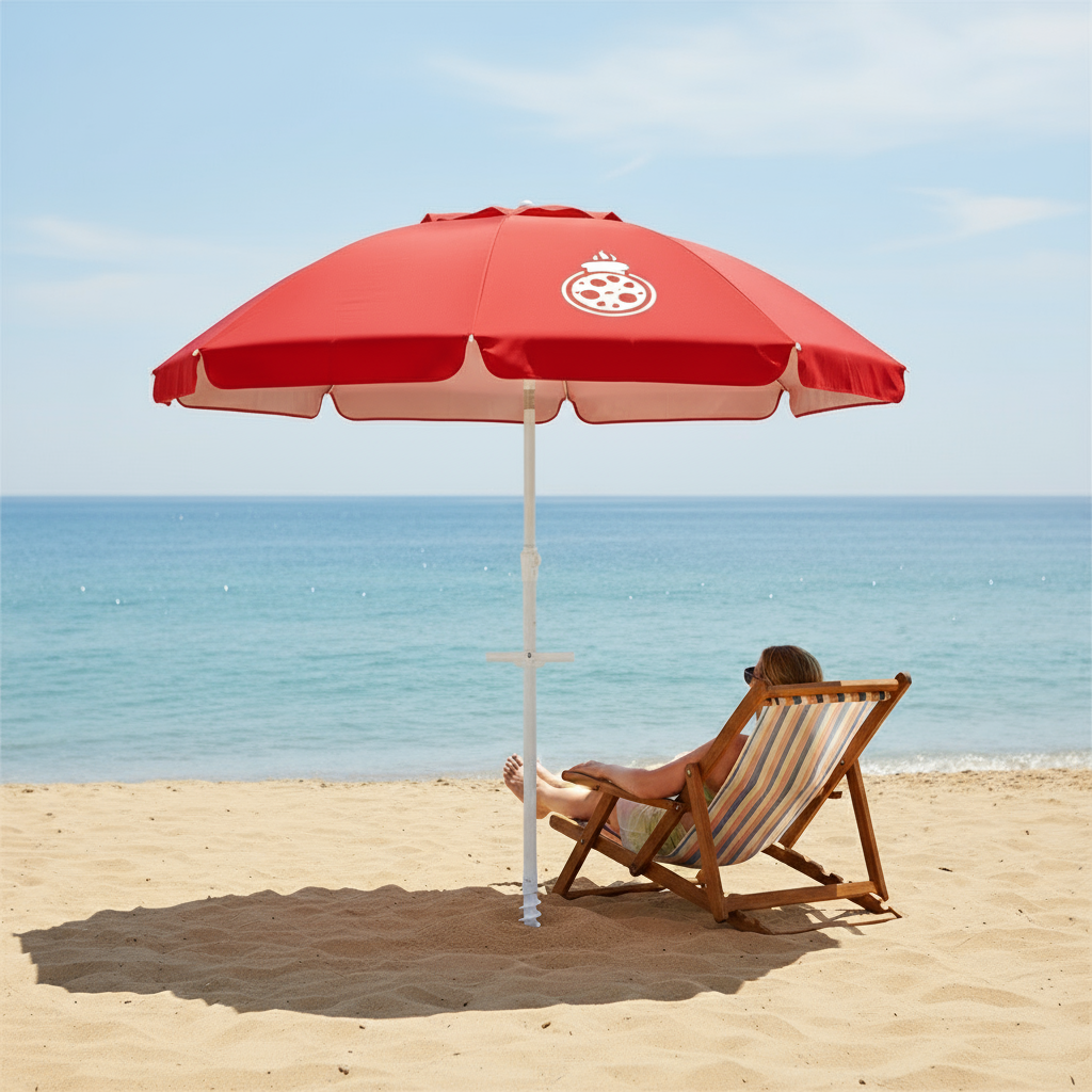 Sombrilla de playa con protección UV, ideal para disfrutar del aire libre con total resguardo. Fabricada con tela de alta resistencia al viento y recubrimiento interior plateado que refuerza la protección solar.